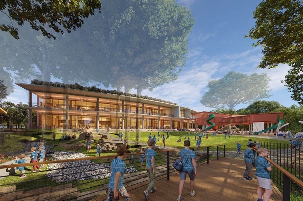 The 2-story massing accommodates a 73,000 SF Reggio Emilia method of learning environment organized via two primary axis- one oriented toward the exterior environments and the second along the classroom core. The program includes 21 classroom cohorts, 11 Enrichment classrooms featuring Science Lab, Language, Steam Shop, Maker Space, Computer Science, Music, Art and Gardento Kitchen spaces, a Multi-purpose gym and theatrical performance space, Library, Flexible Activity Lounge, and Administration space. Interior cohorts and exterior porch spaces integrally create learning space with access to outdoor teaching gardens, animal pens, play-scapes, a classroom treehouse and creek dock. The rooftop activity space provides a functional outdoor learning environment including recreational spaces and learning gardens. Interior Common Area spaces are naturally illuminated and provide space for flexible learning and assembly gathering.